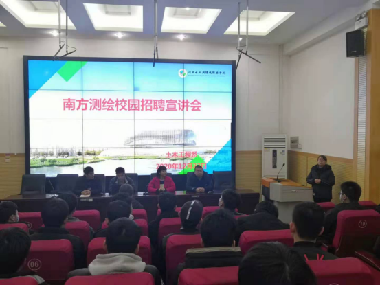 12月22日上午,中国测绘行业龙头、中国500强企业—南方测绘公司来我校举行校园招聘宣讲会。宣讲会在北三阶举行,会议邀请到南方测绘姜远臣等四名企业代表,由工程测量教研室主任杨丽老师主持,教师代表黎瑾慧及工程测量技术、摄影测量与遥感技术、地籍测量与土地管理等专业共70余名师生参加。