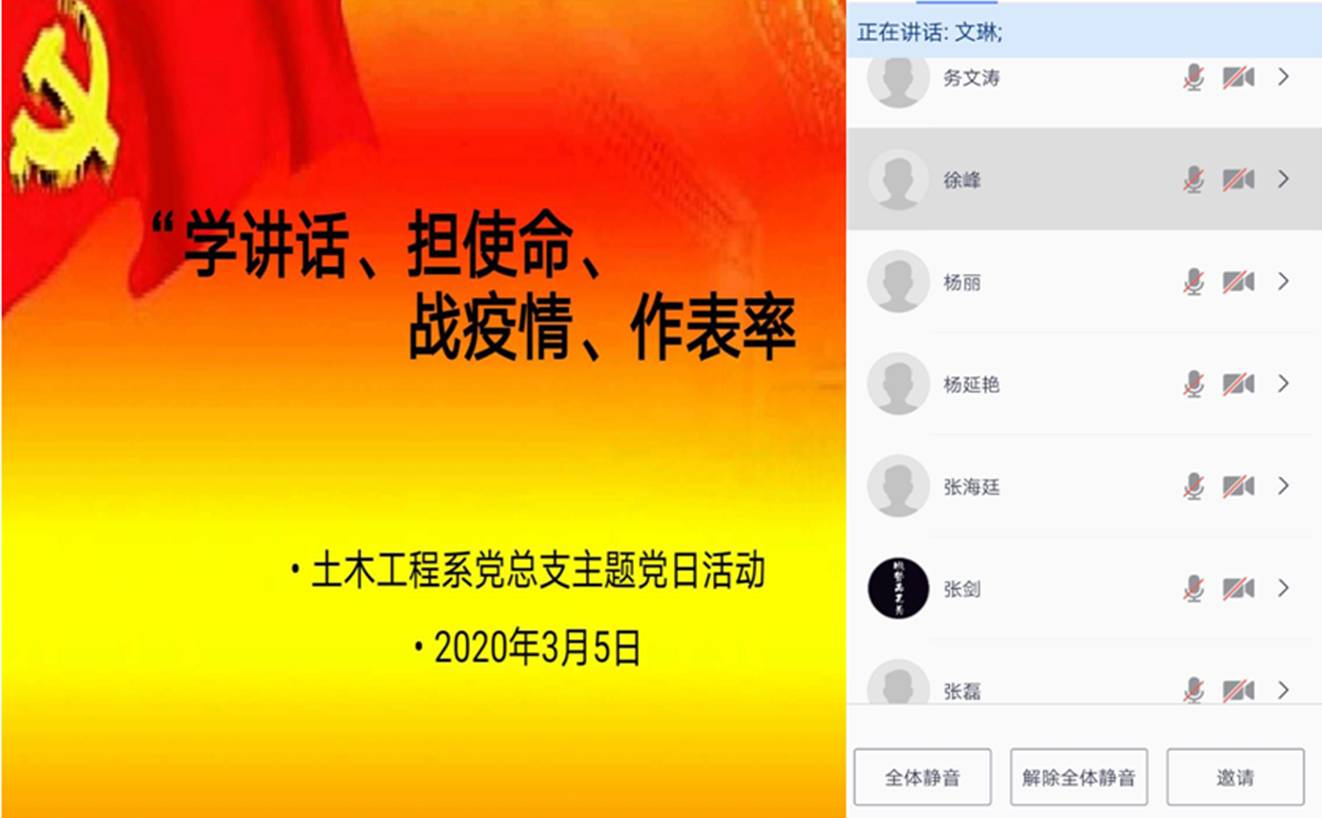 目前全国正处于防控新型冠状肺炎疫情的非常时期,坚决打赢疫情防控阻击战是当前的重大政治任务。如何提高基层党组织生活质量,增强党组织活力,实现组织生活与学校教学工作双促进双提升?2020年3月5日下午四点,土木工程系党总支以腾讯会议的形式召开了特殊时期的“学讲话、担使命、战疫情、作表率”主题党日活动。