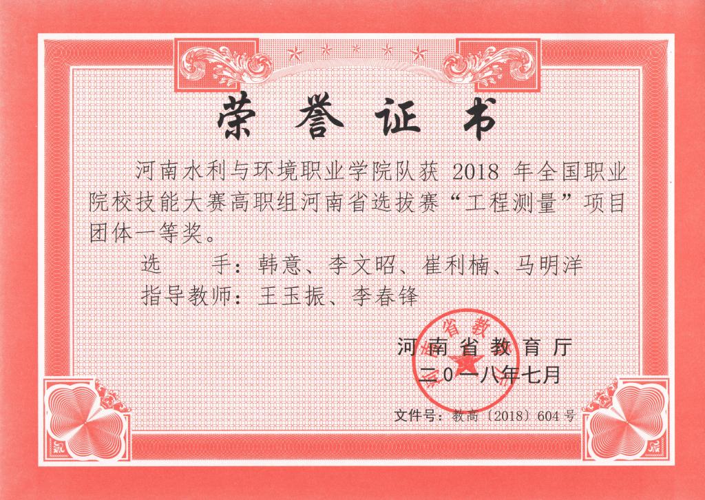 2018年4月7日,由省教育厅主办的“第十一届河南省高职院校技能大赛暨2018年全国职业院校技能大赛高职组河南选拔赛”在全省高职院校陆续拉开帷幕。 我系参加了由黄河水利职业技术学院承办的工程测量比赛项目。经过激烈角逐,我系4位同学从来自全省27支参赛代表队中脱颖而出,排名第二,获得团体一等奖,将代表河南省参加全国比赛。