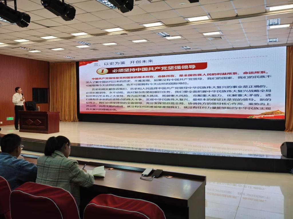 副校长黄功学从“光辉文献,政治宣言”、“丰功伟绩,恢弘史诗”、“以史为鉴,开创未来”三个方面讲解了习近平总书记“七一”重要讲话精神。他告诫同学们要坚定理想信念,紧随党的步伐,拥护党的领导,为实现第二个百年目标贡献自己的力量。
