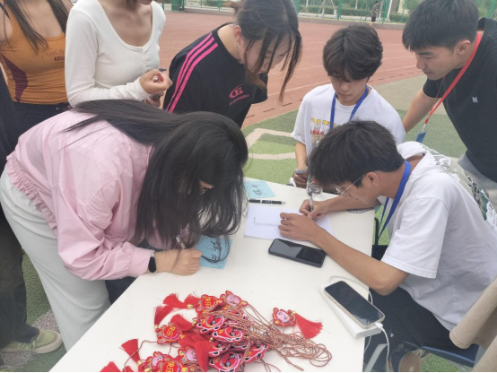 活动分为四个部分,第一部分同学们到达活动地点进行“祈福签到”,每人领取一张祈福卡并写下自己的端午祝福,然后在手作区用准备好的材料制作艾草包,感受浓浓的端午气息。