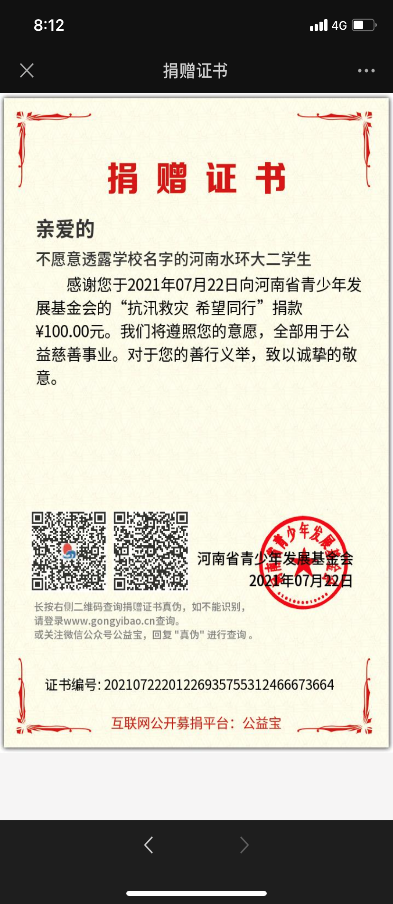 为响应上级团组织“为遭受洪灾的学生办实事”的号召,帮助深陷洪灾的受灾群众,点燃“希望”的明灯。7月22日,土木工程系团总支举办“希望在身边”募捐活动,活动在各个班级群同时开展,土木工程系百余名师生参加了本次活动。