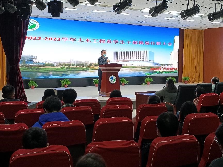 11月15日,土木工程系举行学生干部换届任职大会,党总支书记文琳主持,学管老师、团学干部代表参加。