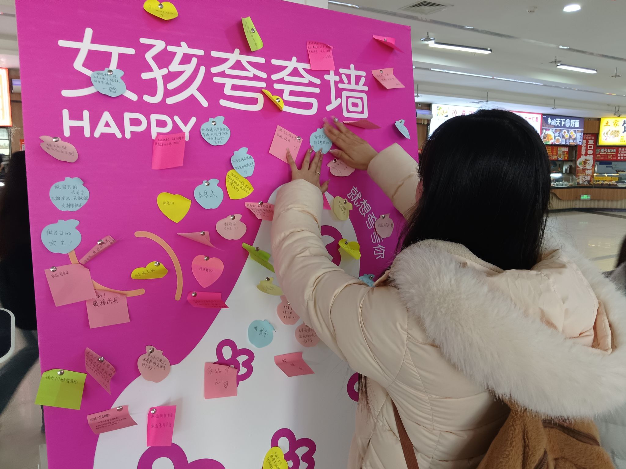 活动设置“出彩之映”“女孩夸夸墙”“送你一朵小红花”三大环节。在“出彩之映”中,同学们五人成组,随机抽取身份卡片,围绕三八国际妇女节主题即兴演绎,以生动表演展现女性坚韧、智慧与奋斗精神。“女孩夸夸墙”活动中,大家在彩色便利贴上写下对女性的赞美,张贴展示,随后领取定制书签、护手霜等礼品。“送你一朵小红花”环节,参与者手持小红花,在校园特色地点拍照,定格当代女大学生阳光自信的美好瞬间 。