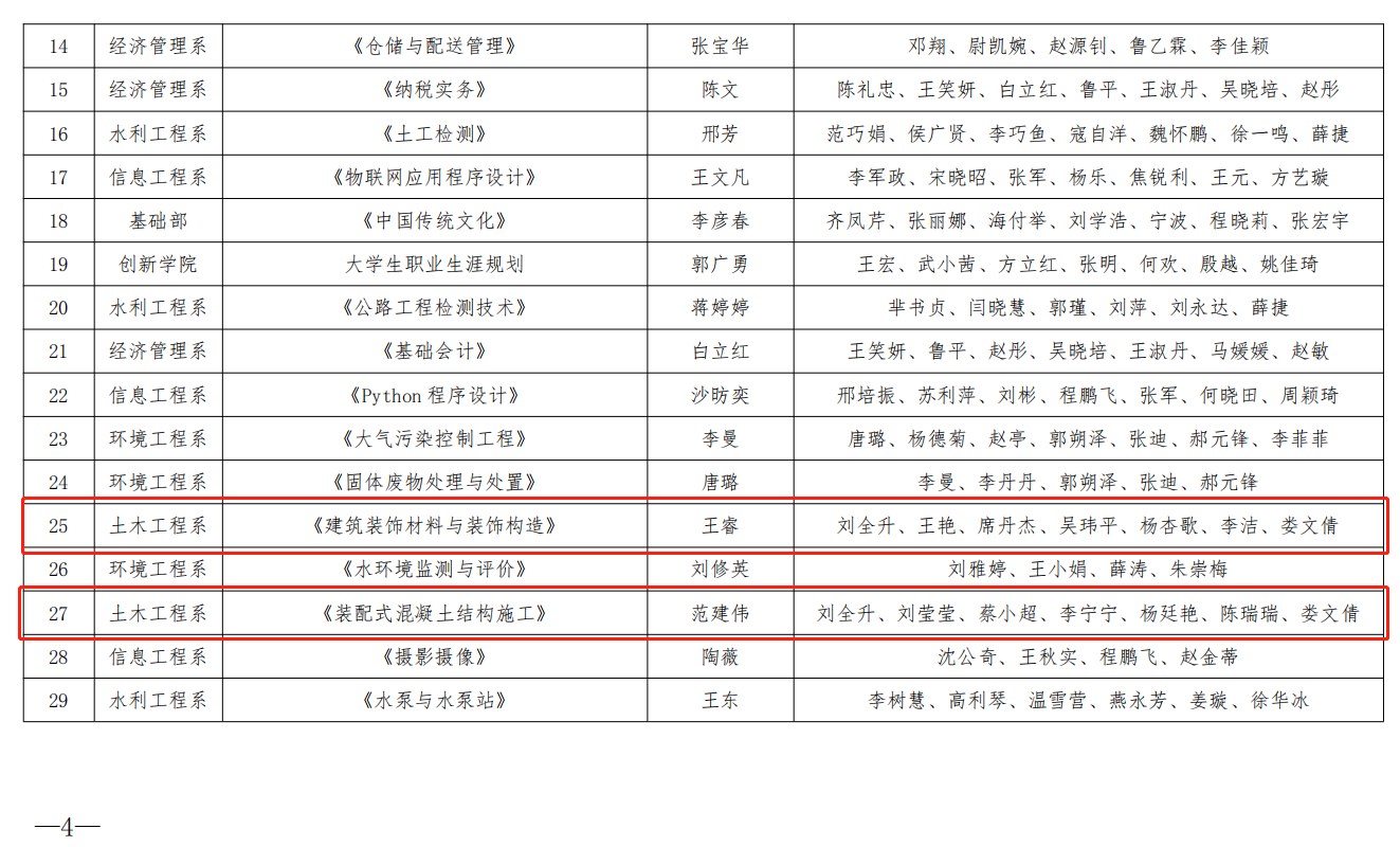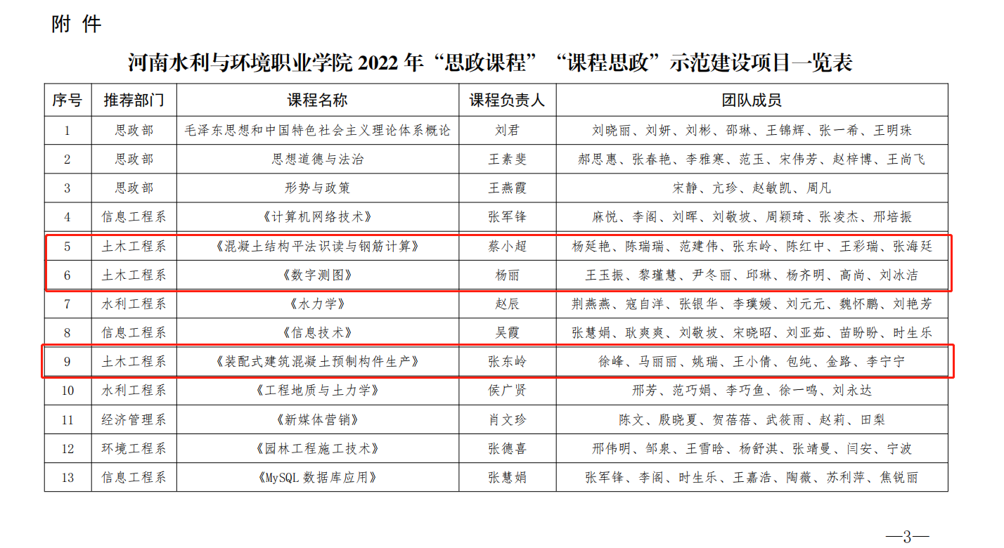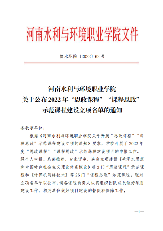 根据《河南水利与环境职业学院关于开展“思政课程”“课程思政”示范课程建设立项的通知》要求,学校开展了 2022 年度“思政课程”“课程思政”示范课程建设项目的申报工作。经个人申报、系部推荐,专家评审,决定立项建设《毛泽东思想和中国特色社会主义理论体系概论》等 3 门“思政课程”示范课程和《计算机网络技术》等 26 门“课程思政”示范课程,我系5门课程获批立项建设。现对立项名单予以公布,请各课程负责人认真组织团队成员做好项目建设工作,相关单位做好项目建设的督促和保障工作。