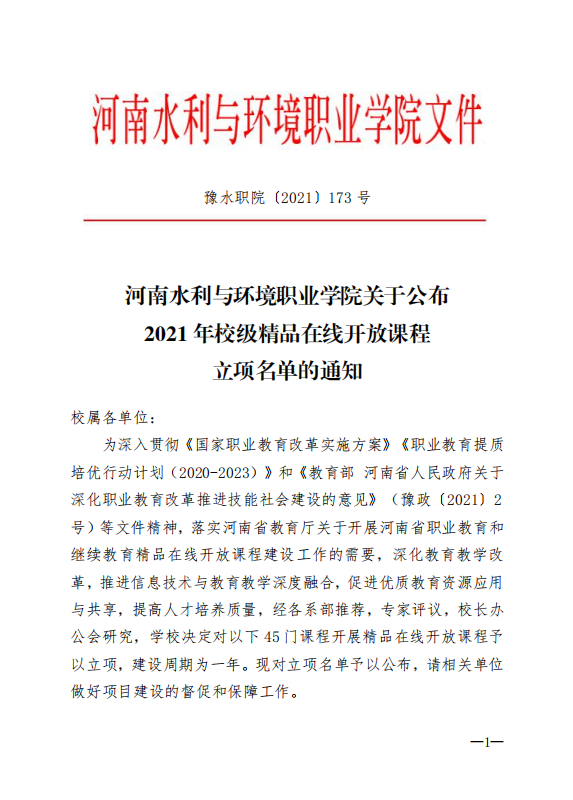 为深入贯彻《国家职业教育改革实施方案》《职业教育提质优行动计划(2020-2023)》和《教育部 河南省人民政府关于深化职业教育改革推进技能社会建设的意见》(豫政〔2021〕2号)等文件精神,落实河南省教育厅关于开展河南省职业教育和继续教育精品在线开放课程建设工作的需要,深化教育教学改革,推进信息技术与教育教学深度融合,促进优质教育资源应用与共享,提高人才培养质量,经各系部推荐,专家评议,校长办公会研究,学校决定对以下 45 门课程开展精品在线开放课程予以立项,建设周期为一年。我系13门课程入选立项建设,现对立项名单予以公布,请相关单位做好项目建设的督促和保障工作。