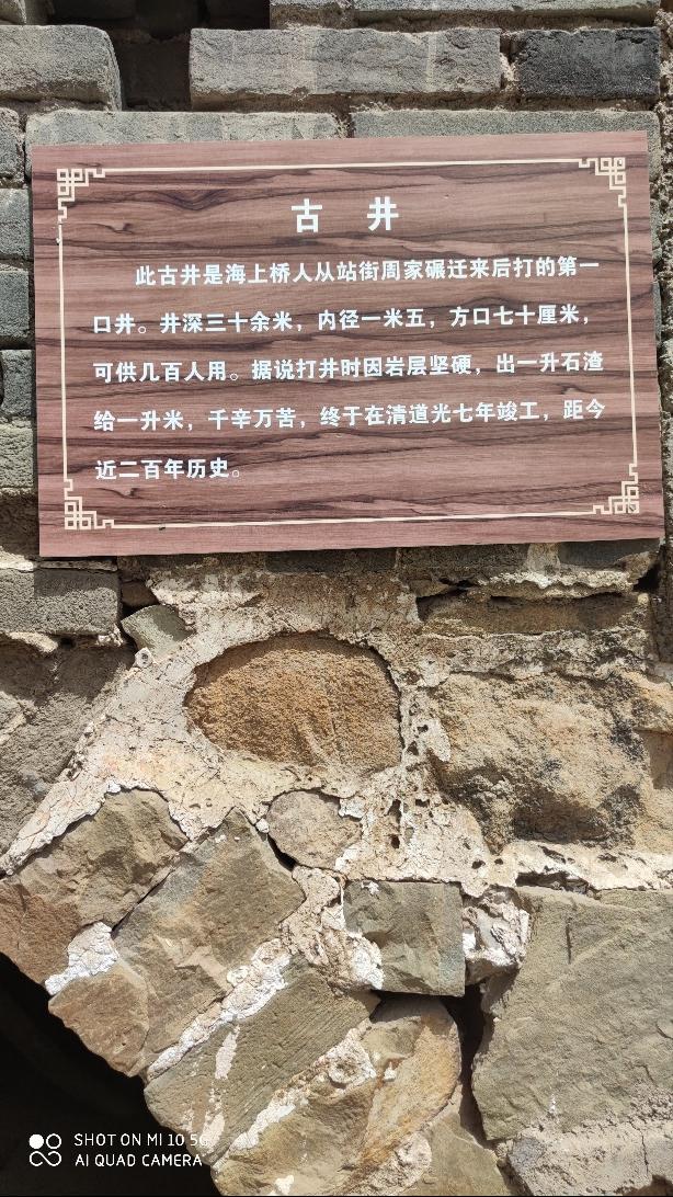 建于清嘉庆年间,是海上桥人从站街迁徙此地后开挖的第一口井。方口70厘米,可供几百人饮用。据说打井时因岩层坚硬,出一升石渣给一升米,夜以继日,才得以竣工,距今已近200年。